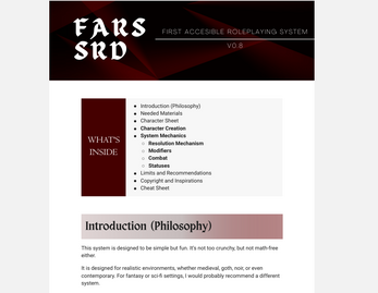 This SRD is the product of many months of thought, and today I'm releasing it for the Celebrating SRDs Jam. I'm confident many players will help playtesting the system and taking it to the next level.